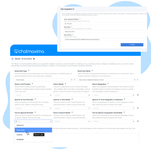 Log in to ChatMaxima, navigate to the Integrations section, and click “Add Integration.” Select "ElevenLabs" as the platform, provide a name for the integration, and enter your API key to securely link your ElevenLabs account.