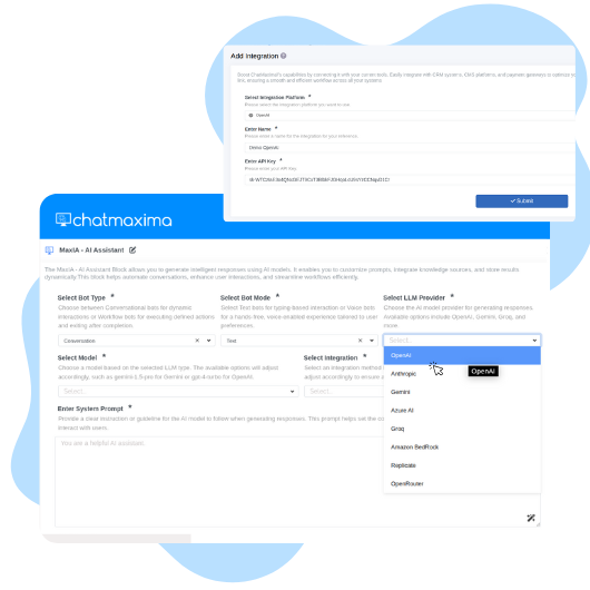 Log in to ChatMaxima, navigate to the Integrations section, and click “Add Integration.” Select "OpenAI" as the platform, provide a name for the integration, and enter your API key to securely link your OpenAI account.