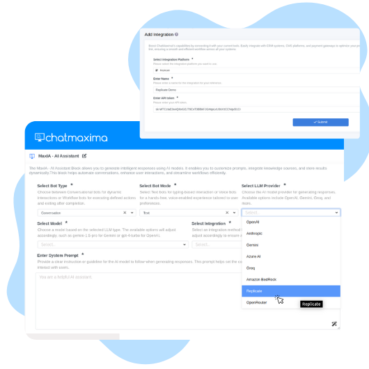 Log in to ChatMaxima, navigate to the Integrations section, and click “Add Integration.” Select Replicate as the platform, provide a name for the integration, and enter your API key to securely link your Replicate account.