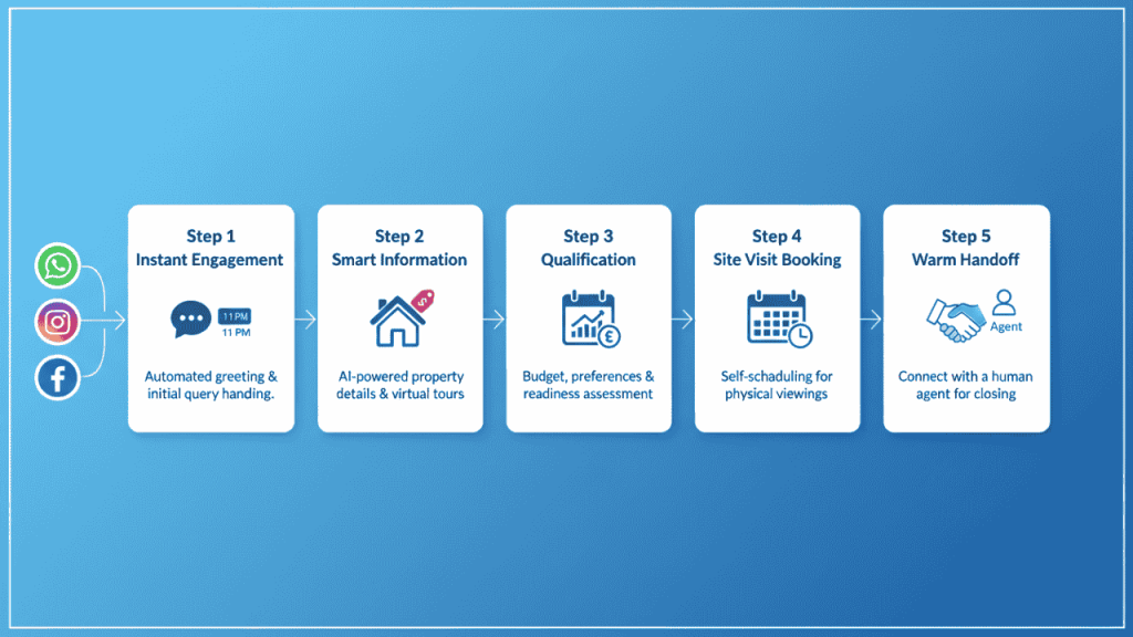 Step 5: Warm Handoff The assigned sales agent receives a complete conversation summary: the prospect is a first-time homebuyer with pre-approved financing of ₹90 lakhs, interested in the 2BHK for self-use, and available to close within 60 days. The agent walks into the site visit prepared, not blind.