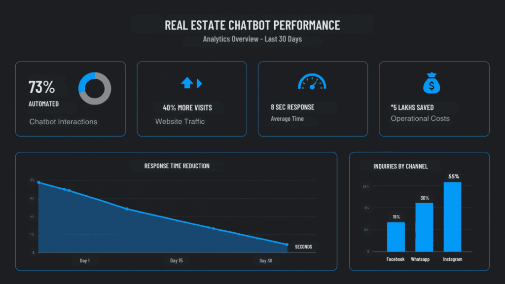 Response time dropped from 2 hours to 8 seconds. This single metric represented the biggest shift. In real estate, speed matters enormously. The first agent to respond captures the lead in most cases. By being available instantly, around the clock, the company stopped losing leads to faster competitors.