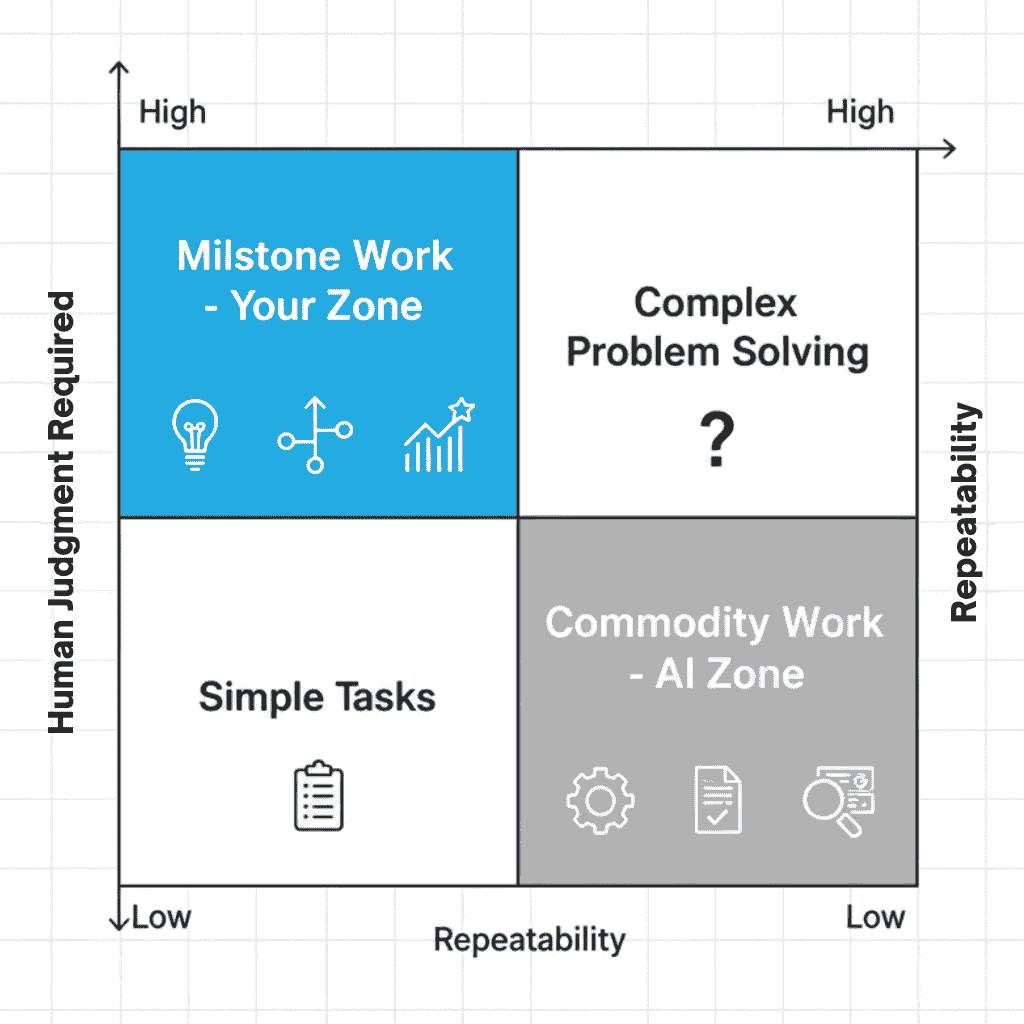 The second is milestone work: tasks that require expertise, judgment, creativity, or human connection. This is the work that becomes more valuable as AI handles the commodity layer.