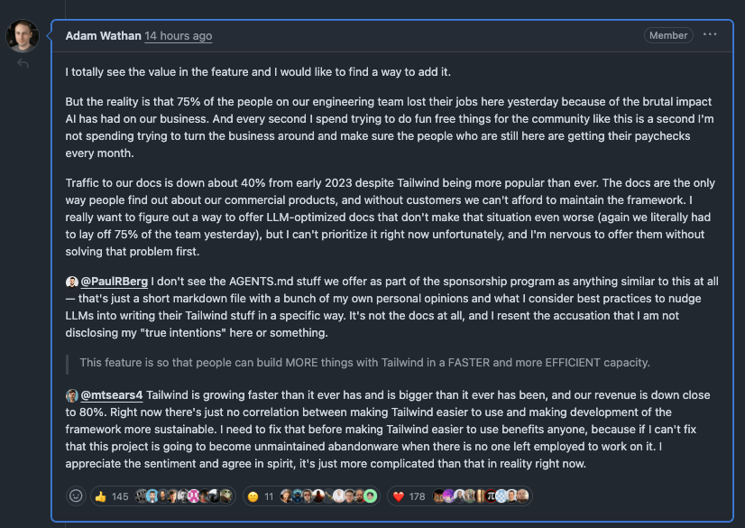 Tailwind is more popular than ever. Revenue is down 80%. He just laid off 75% of his engineering team.