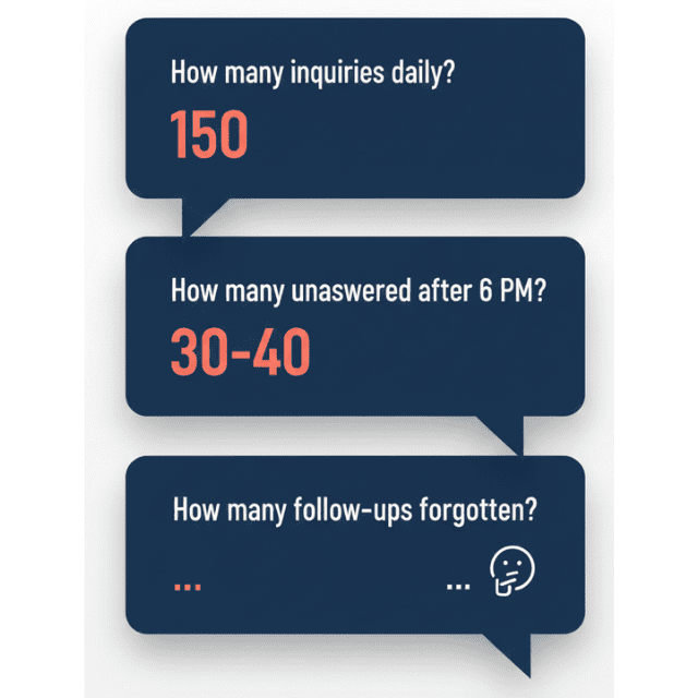 Out of 150 daily inquiries, your team misses 35 after-hours messages (23%), forgets 10 follow-ups during busy periods (7%), and provides slightly outdated information on 5 conversations because the spreadsheet wasn’t current (3%). That’s a combined invisible error rate of 33%, and none of these show up in any quality report.