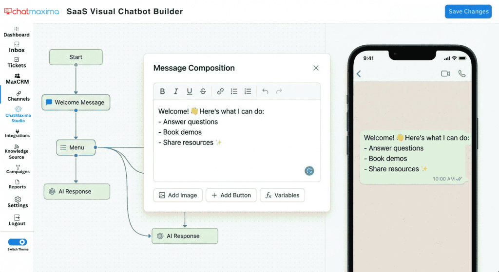 Building a WhatsApp chatbot doesn’t require a development team or months of work. With ChatMaxima’s no-code builder, you can create an automated assistant in under 15 minutes that handles inquiries 24/7, qualifies leads, and frees your team to focus on high-value conversations.