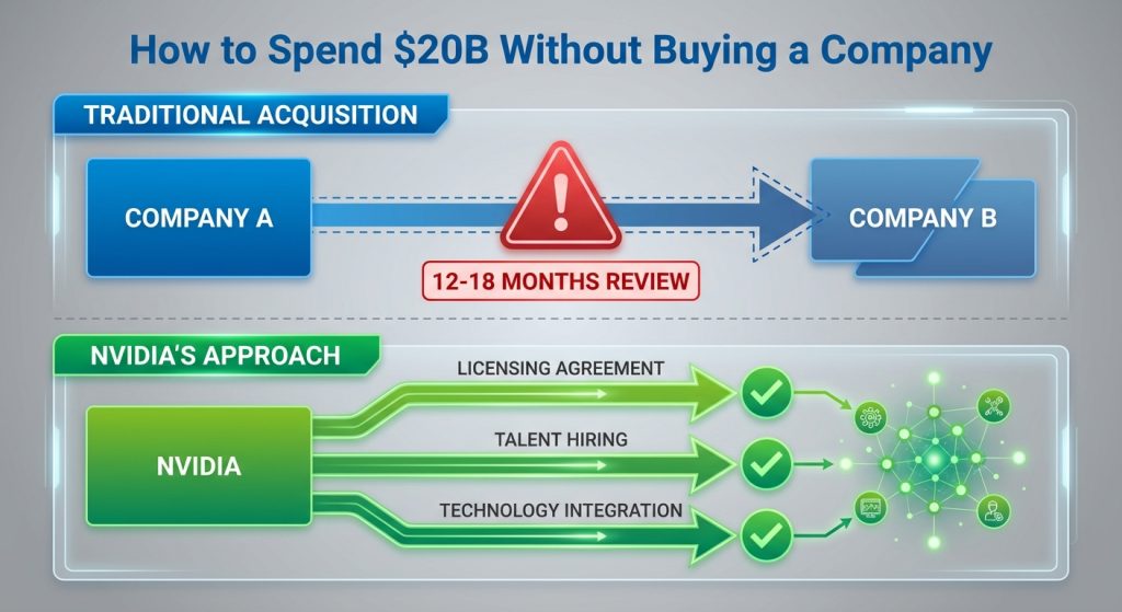 Nvidia tried this approach earlier in 2025, paying over $900 million for Enfabrica’s talent and technology through a licensing arrangement. The Groq deal is the same strategy, but at 20x the scale.
