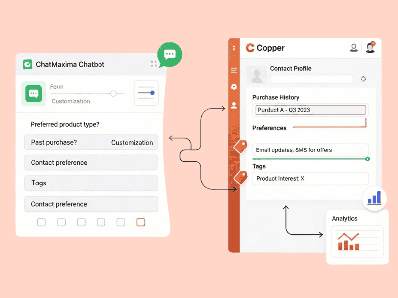 Automatically map chatbot interactions, lead details, and customer feedback directly into Copper CRM as they occur. This ensures your database remains up-to-date, supporting timely responses and informed decision-making.